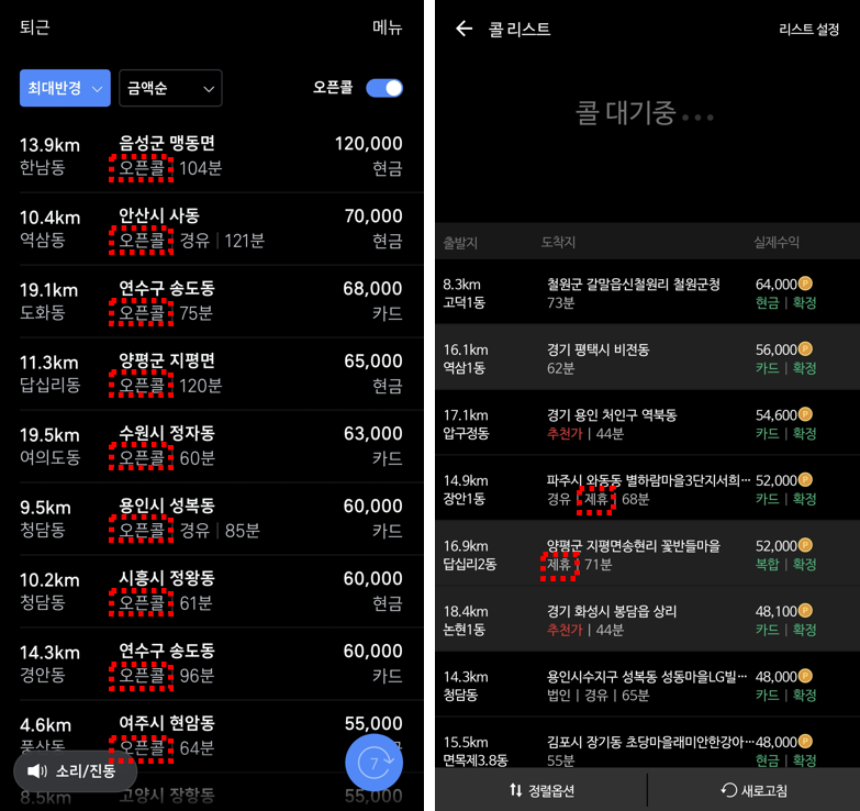 아래 두 앱의 콜 대기 화면을 보면 왼쪽 T맵 대리는 오픈콜(제휴콜)천국이다. 반면에 오른쪽 카카오 대리는 대부분이 자체 콜이다.