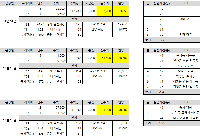 나의 경우 친구 차는 중형 SUV, 내 차는 준중형 세단이었기 때문에 내 차로 시작했었다. 아무래도 이것 때문에 친구가 원데이 보험을 드는 건 오버고 주로 내가 뒷차를 했었다. 그래도 가끔 좋은 게 보이면 내가 수락하고 친구보고 조심히 운전하여 오라고 하기도 했었다. 아래는 투명한 수익 분배와 생산성 분석을 위해 작년에 작성하던 엑셀이다. 귀찮기도 하지만 작성하다 보면 무엇을 개선해야 할지, 어디를 가고, 가지 말아야 할지 등등 데이터가 쌓여 많은 도움이 되었었고 지금까지도 머릿속에 있기 때문에 혼자 하는데도 도움이 된다.