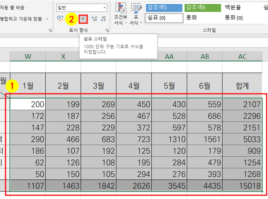2) 숫자가 더 잘 구분되고 눈에 띄었으면 좋겠다. 홈의 메뉴를 사용하여 간단하게 1000 단위 구분 기호를 넣어주자.