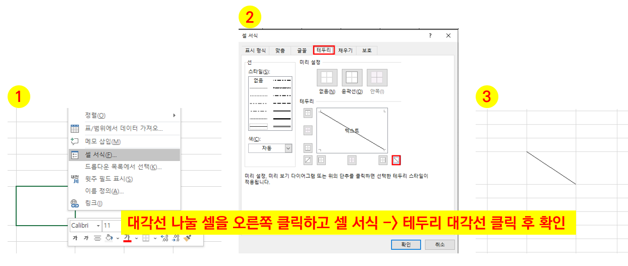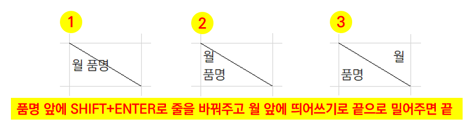 셀에 대각선이 들어간 것을 확인할 수 있다. 이 상태에서 문자를 쓰면 아래 왼쪽과 같이 나오기 때문에 수정이 필요하다.
