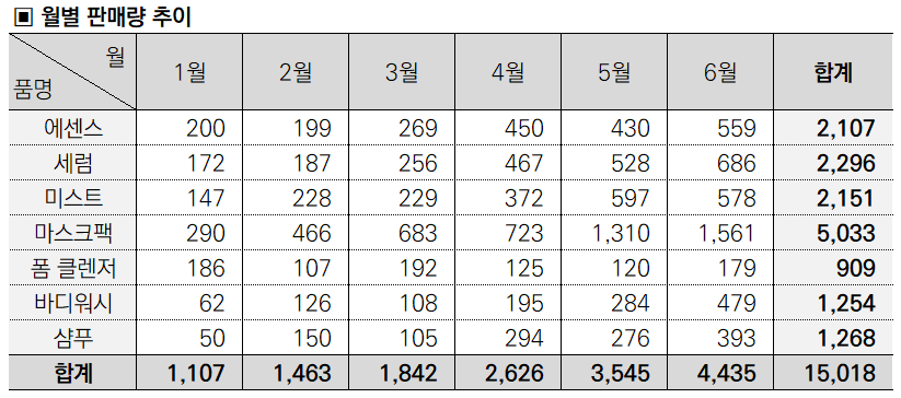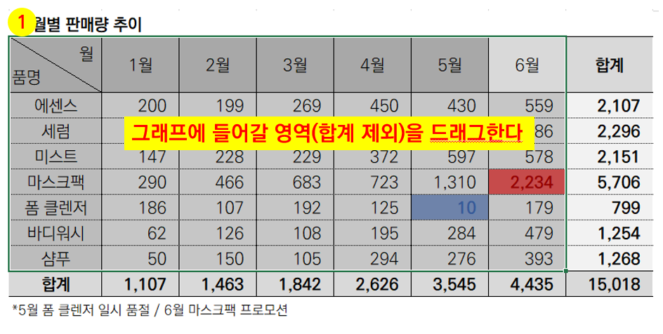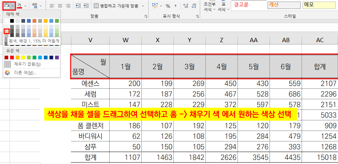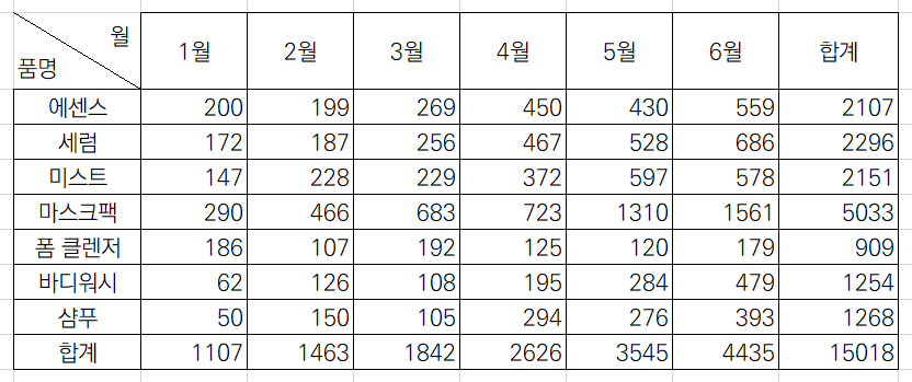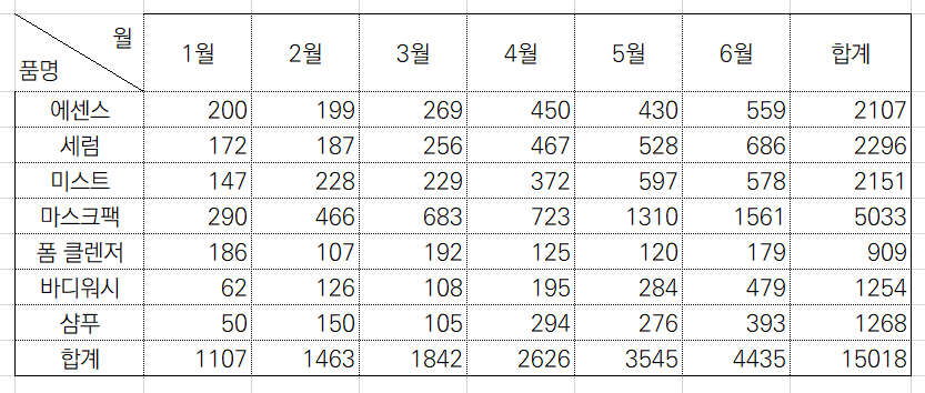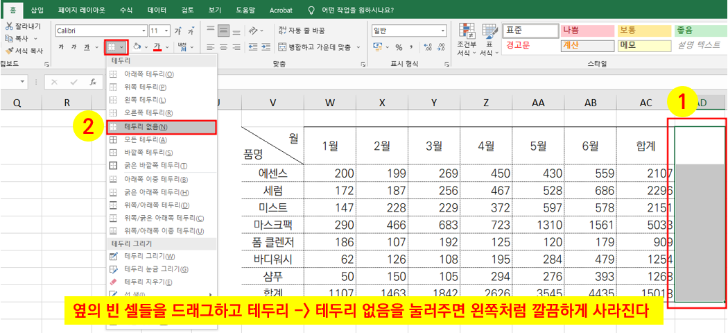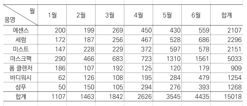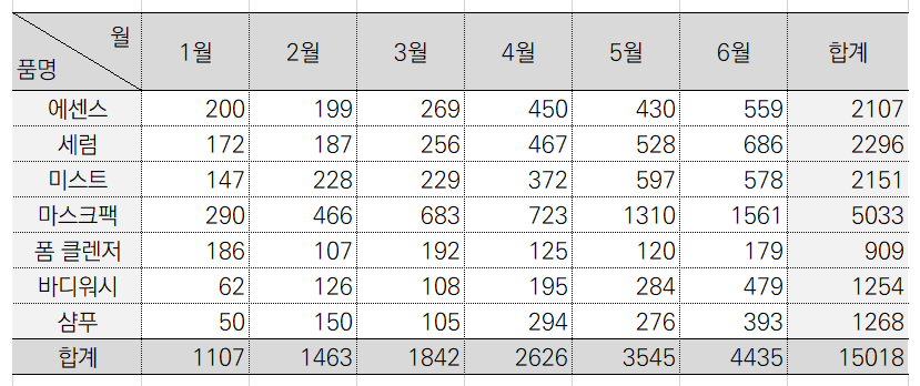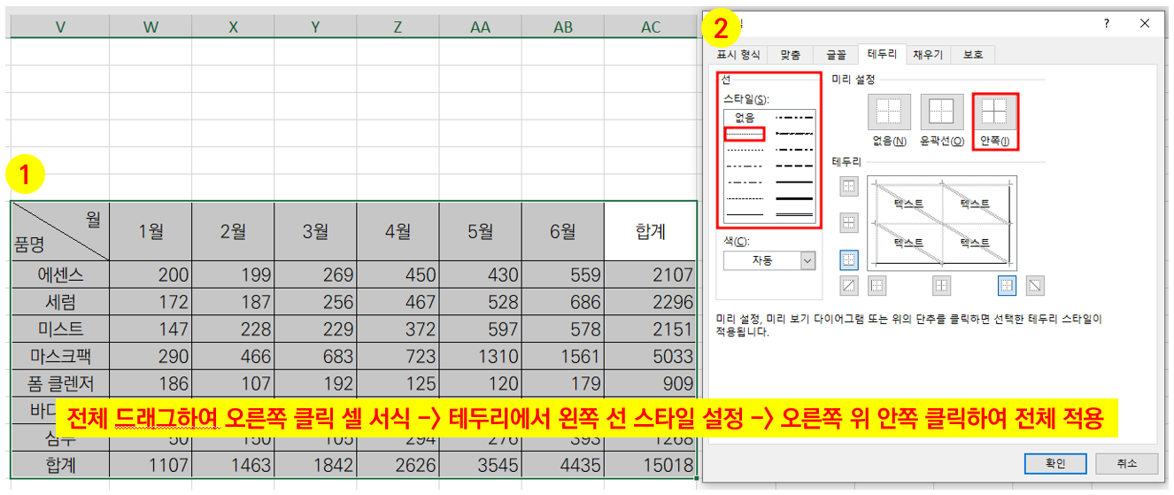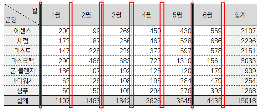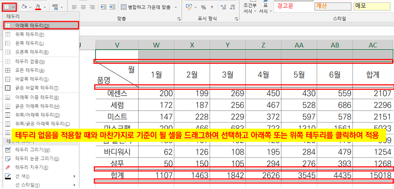 다음으로 표의 상단과 하단, 월과 합계 부분을 아래와 같이 가로 직선 테두리로 덮어준다.