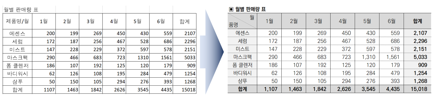 아래 왼쪽의 데이터만 입력된 밋밋한 표를 오른쪽과 같이 만들 예정이다.