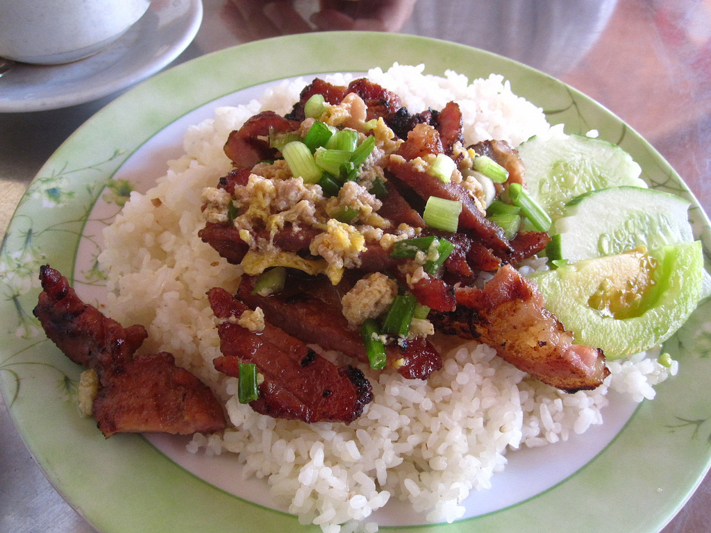 야자 설탕, 마늘, 코코넛 밀크, 생선 소스에 재워진 돼지고기를 구워 밥과 함께 먹는 이른바 캄보디아식 제육덮밥이라고 할 수 있겠다. 우리 입맛에도 잘 맞고 흔하게 볼 수 있다고 한다.