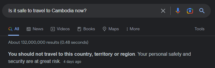 구글에서 검색해보니 안전과 보안이 큰 위험에 처할 수 있다고 이 나라를 가서는 안 된다고 단호하게 말한다. 이런 반응은 처음 본다.