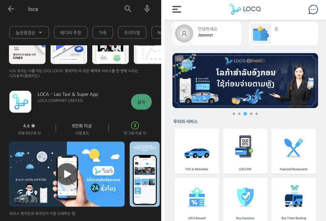 대부분 동남아에서 그랩이 통하지만 라오스는 로카로 통한다. 가입할 때 폰번호 인증이 필요한데 현지에서는 어려울 수 있으니 플레이스토어를 통해서 미리 설치 및 가입 완료하고 가자.