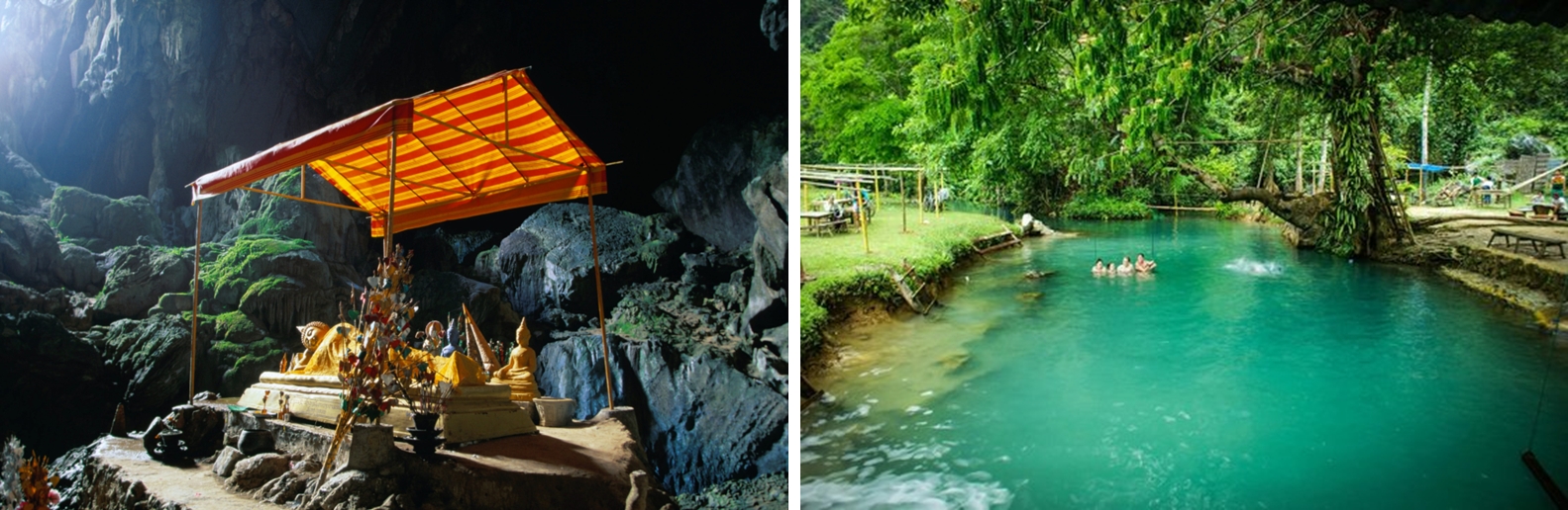 방비엥 중심부에서 북쪽으로 15km 떨어진 곳에 위치한 500m 길이의 물 동굴로, 내부에서 튜빙을 통해 이동할 수 있다. 건기에는 얕아져서 일부 구간은 걸어서 지나가야 한다. 끝까지 도달하는 데는 약 20분이 소요된다고 한다. 동굴 내부에서 튜브로 이동이라, 특별한 경험이 될 것 같다. 입장료는 10,000낍(약 730원)이다.