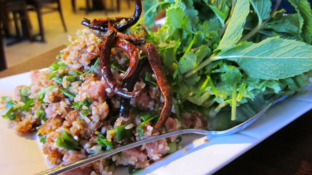 튀긴 주먹밥과 시큼한 돼지고기, 땅콩, 간 코코넛, 말린 고추와 각종 향신료를 섞어 만든 라오스식 샐러드이다. 서양에서 크리스피 라이스 샐러드라고 불리며 애피타이저로 인기를 끌고 있다고 한다. 꼭 먹어봐야겠다.
