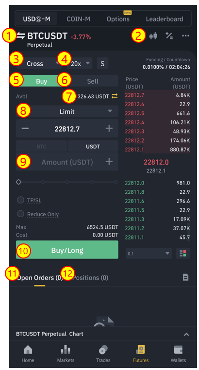 ① 암호화폐 종류 선택. 현재 비트코인 (영문약자+USDT로 표시됨.)