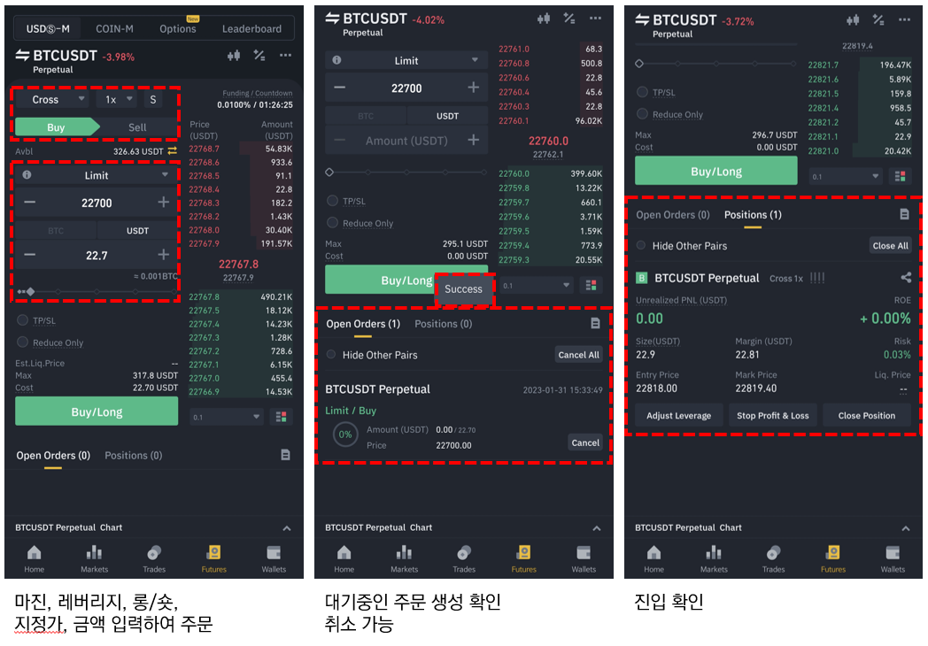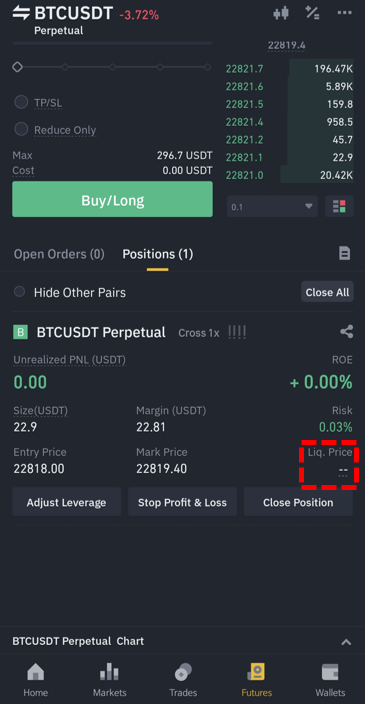 아래 그림은 스크린샷을 위해 레버리지 없이 진입해서 청산가격이 없지만, 레버리지를 사용하면 청산가격을 확인할 수 있다.