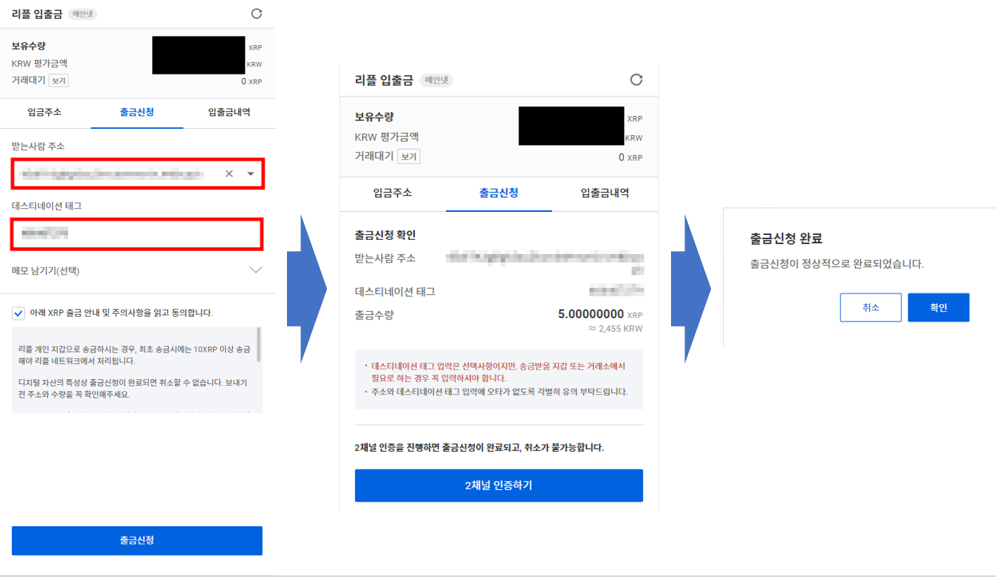 ② 받는 사람 주소 및 태그 입력, 출금신청 후 2채널 인증 (카카오, 네이버 인증서)