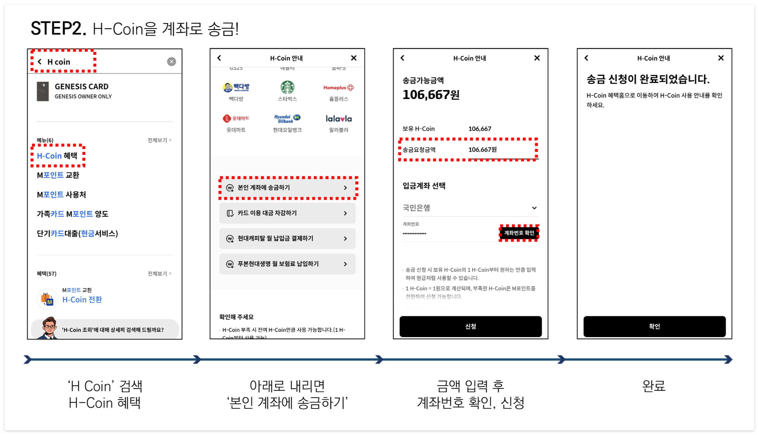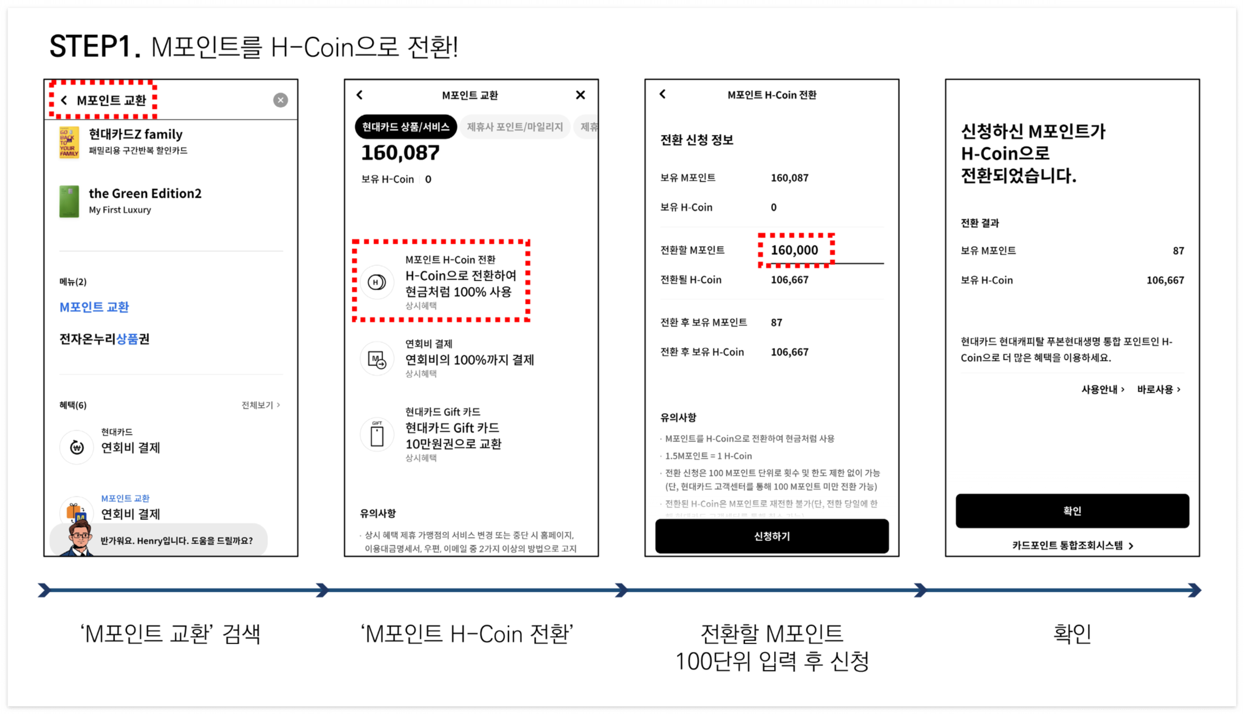 1) 현대카드 모바일/PC를 통해 M포인트를 H-Coin으로 전환 (비율: 1.5:1)